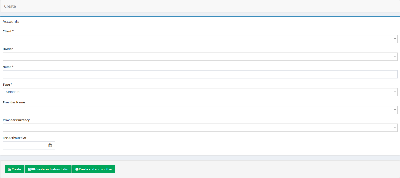Provider account numbers | Account numbers delivered by the service provider. The field displays all account numbers, currencies, and requisites for the opened account; a multi-currency account can be provided with several account numbers. There is an additional parameter available for the Clear Bank service provider: