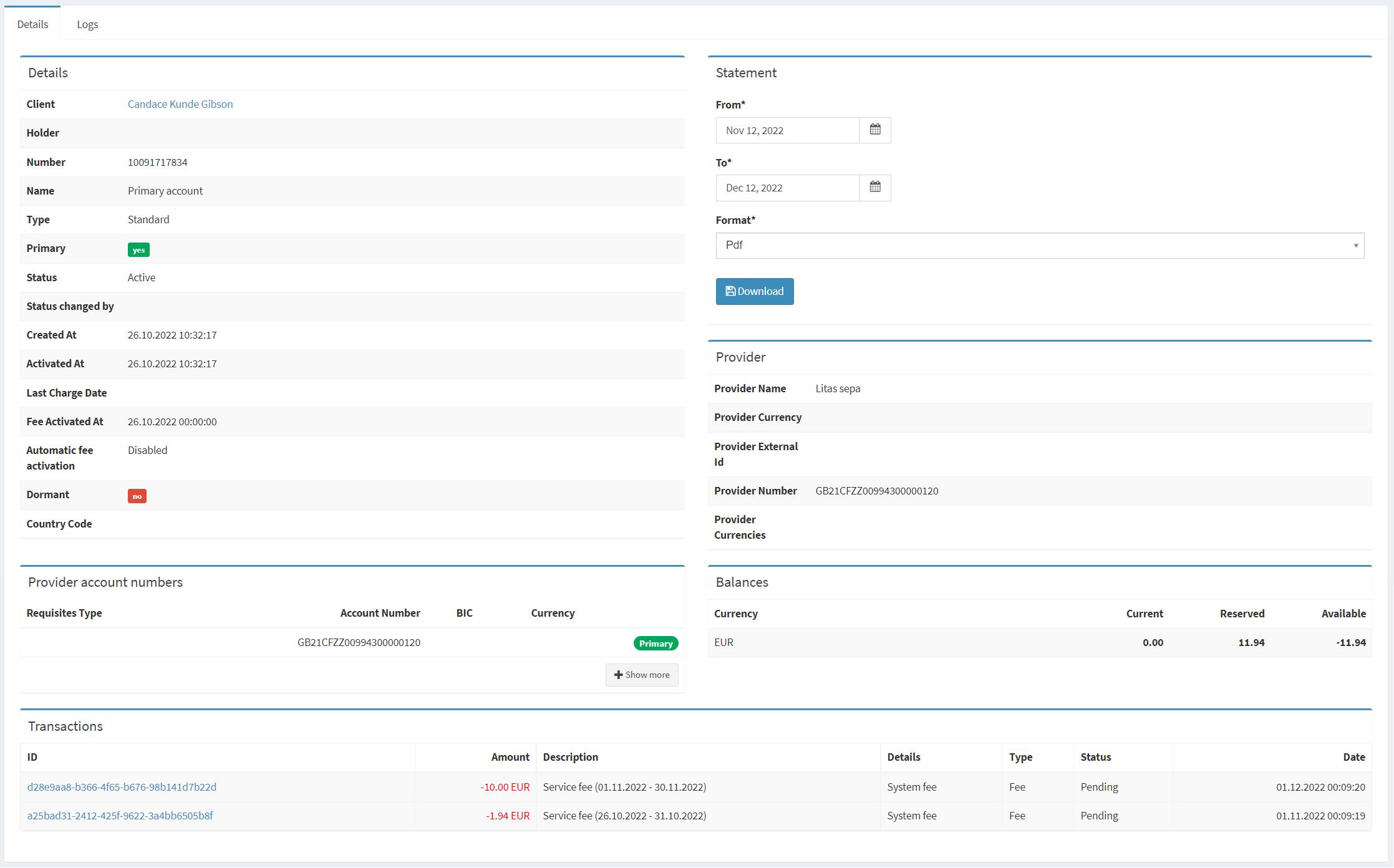 Provider number | An IBAN generated by the financial service provider. Once the IBAN is generated, it is not possible to change it. |