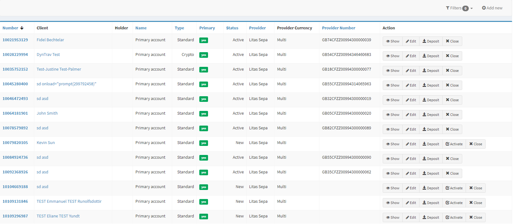 Accounts with no service provider defined in the Provider field are created without account details and can be used for manual transactions. When a manual payment is sent from such accounts, it is processed virtually with no real funds engaged: it is up to the White Label to choose a method of how to deposit real funds to the recipient’s account. Additionally, a White Label can manually generate IBANs for such accounts, though other account details will not be visible in the UI. |