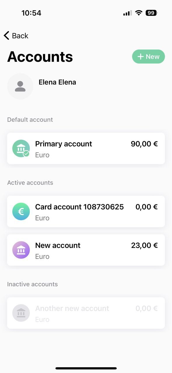 The Primary account is opened automatically once the user profile is created. All additional accounts are not limited in quantity and can be opened manually via the Mobile Interface. Select an account from the list to set it as default.