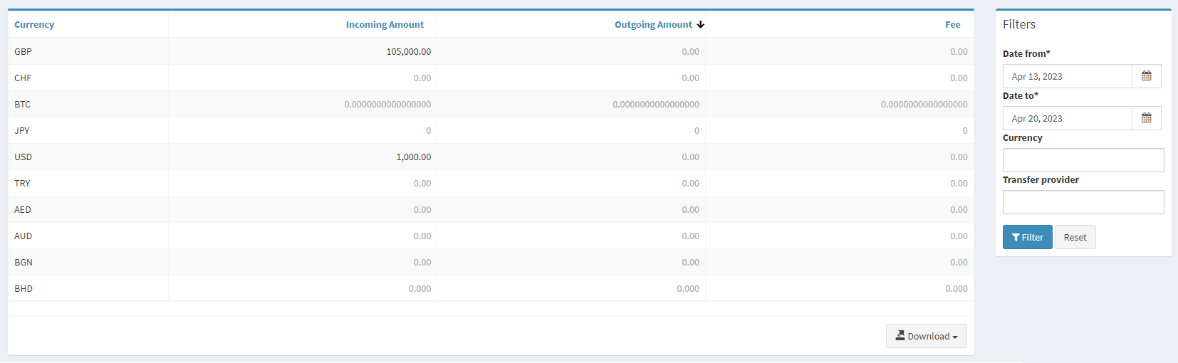 Fee | The total amount of fees charged for payments made in the currency. All accounts in the system are considered. |