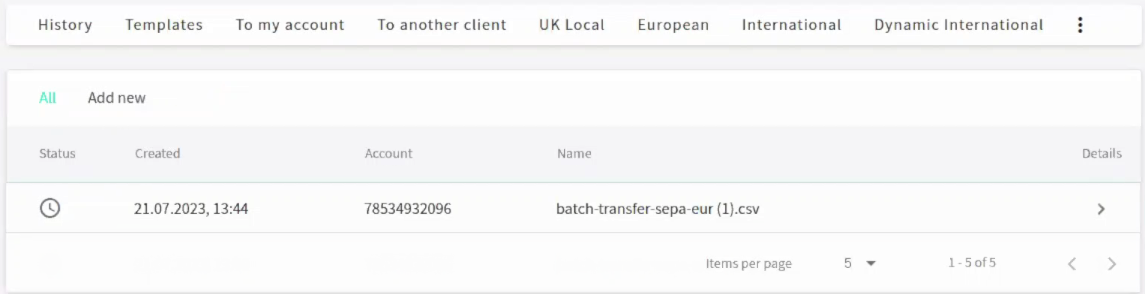 You can check the current status of a batch payment directly in the table on the All tab of the Batch section. For more information on each status, click the details button of a batch payment in the table.