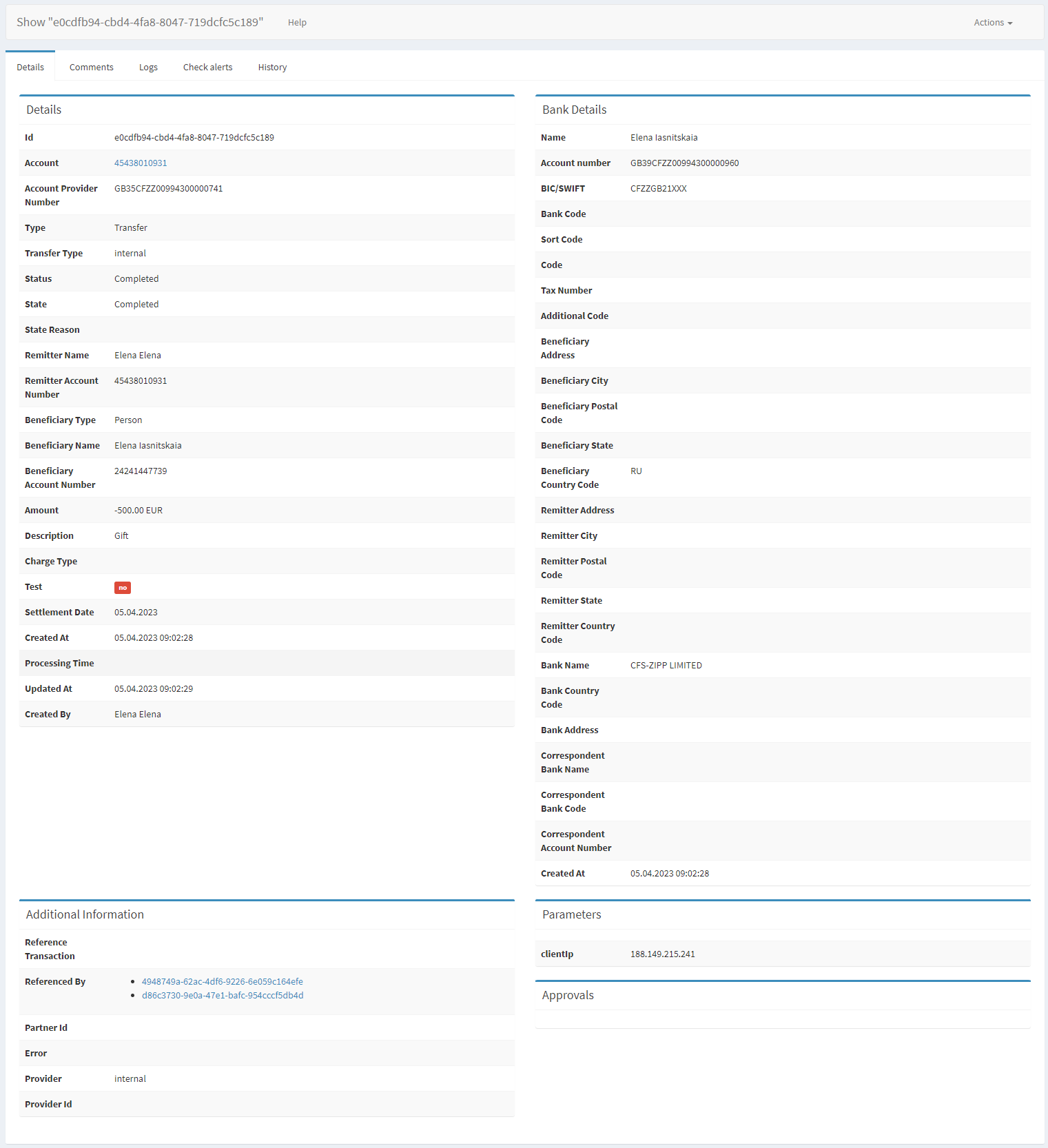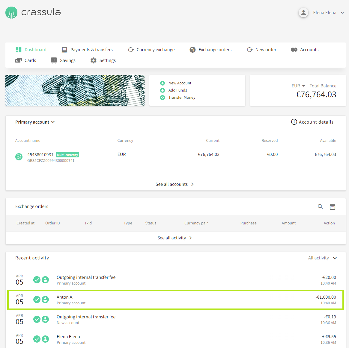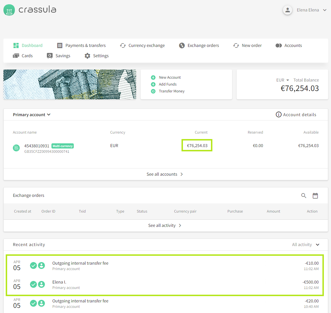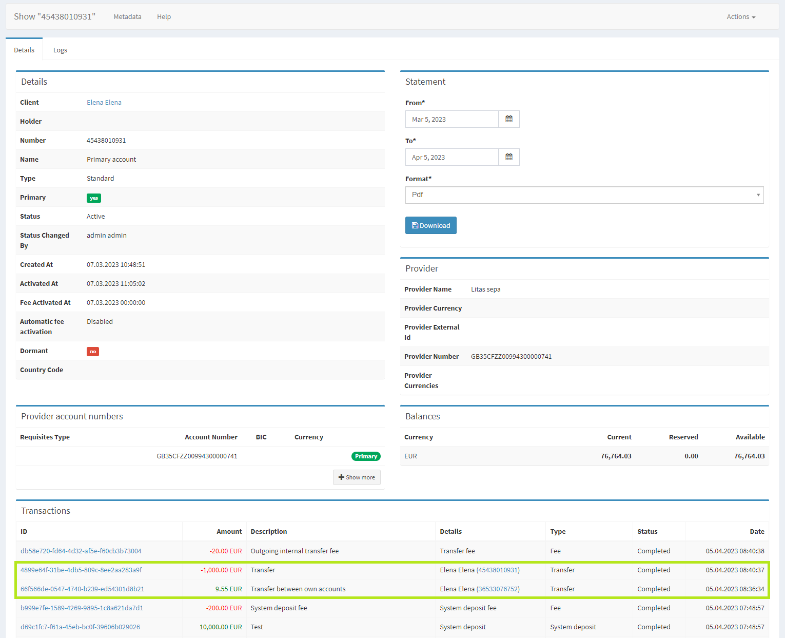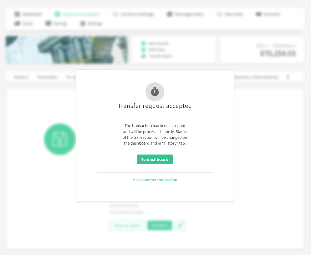 Once the transfer is complete, the transaction status is updated in the list of client transactions. The account balance is decreased by 510 EUR (incl. commissions).