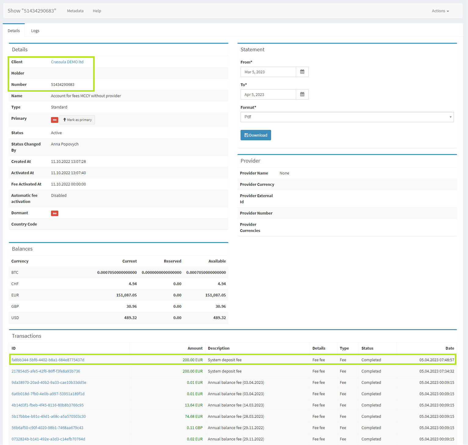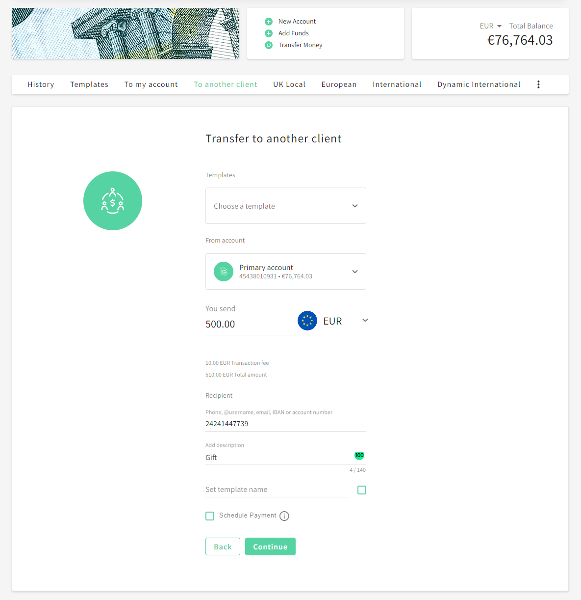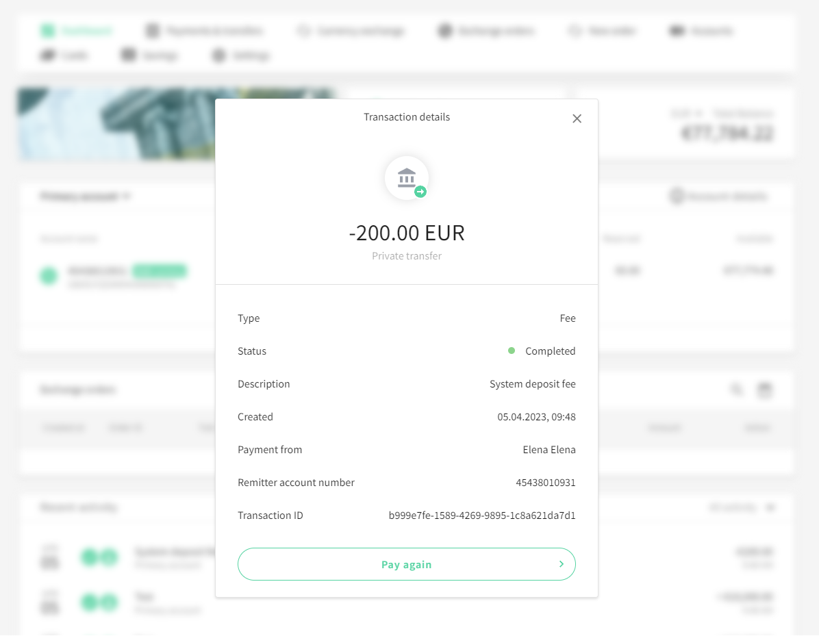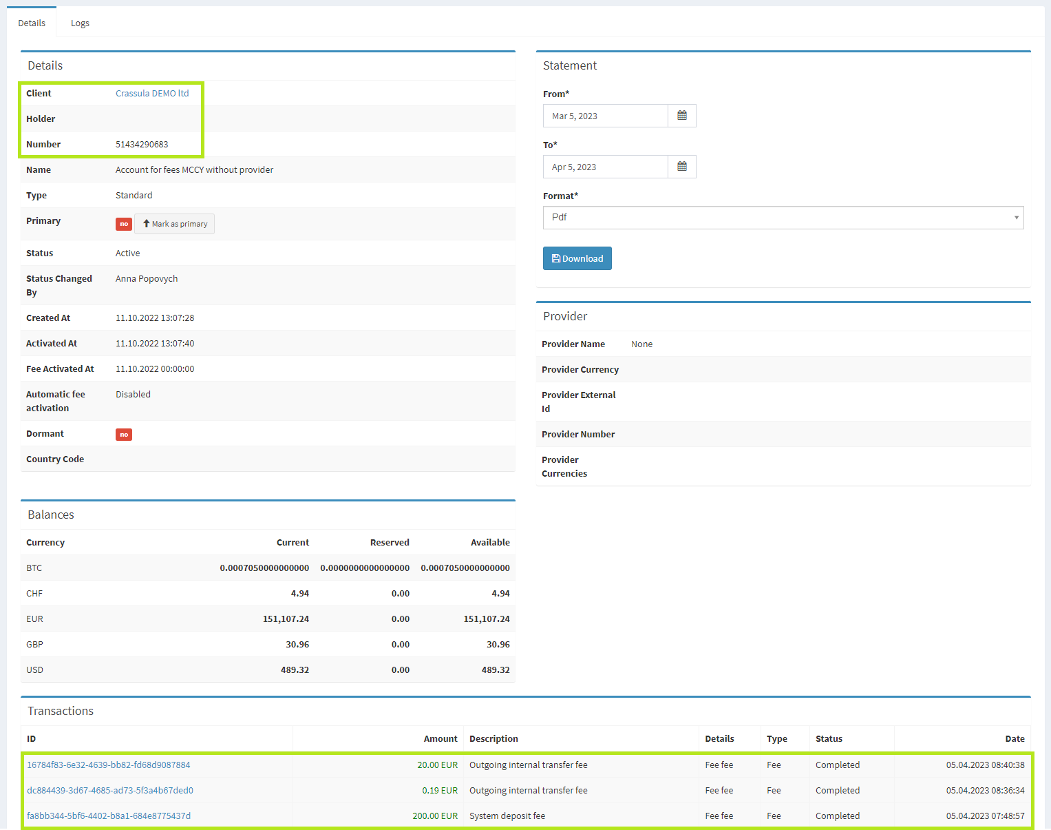 Once the transfer is complete, the transaction status is updated in the list of client transactions. The account balance is decreased by 510 EUR (incl. commissions).