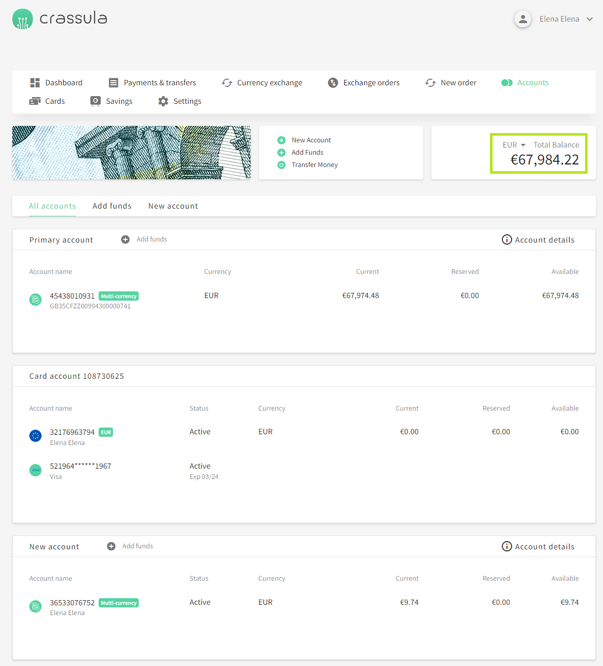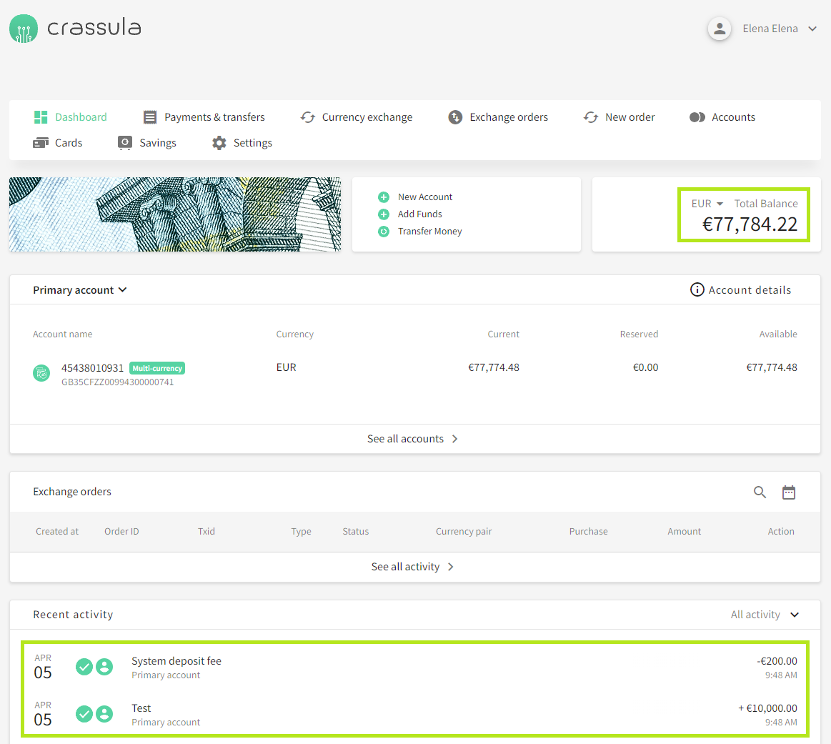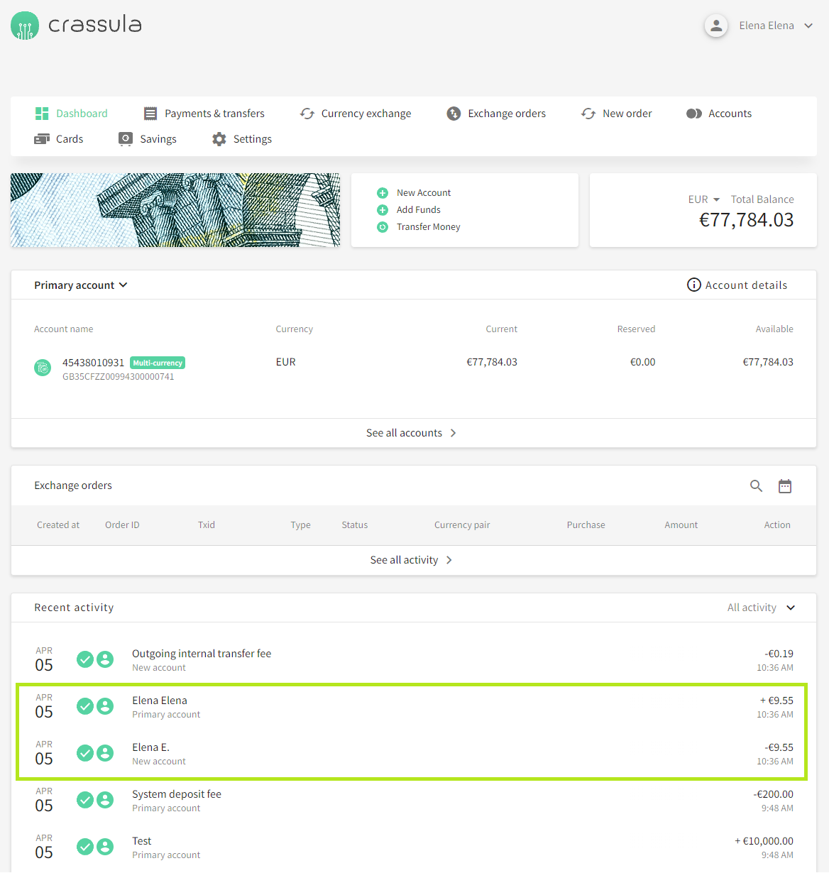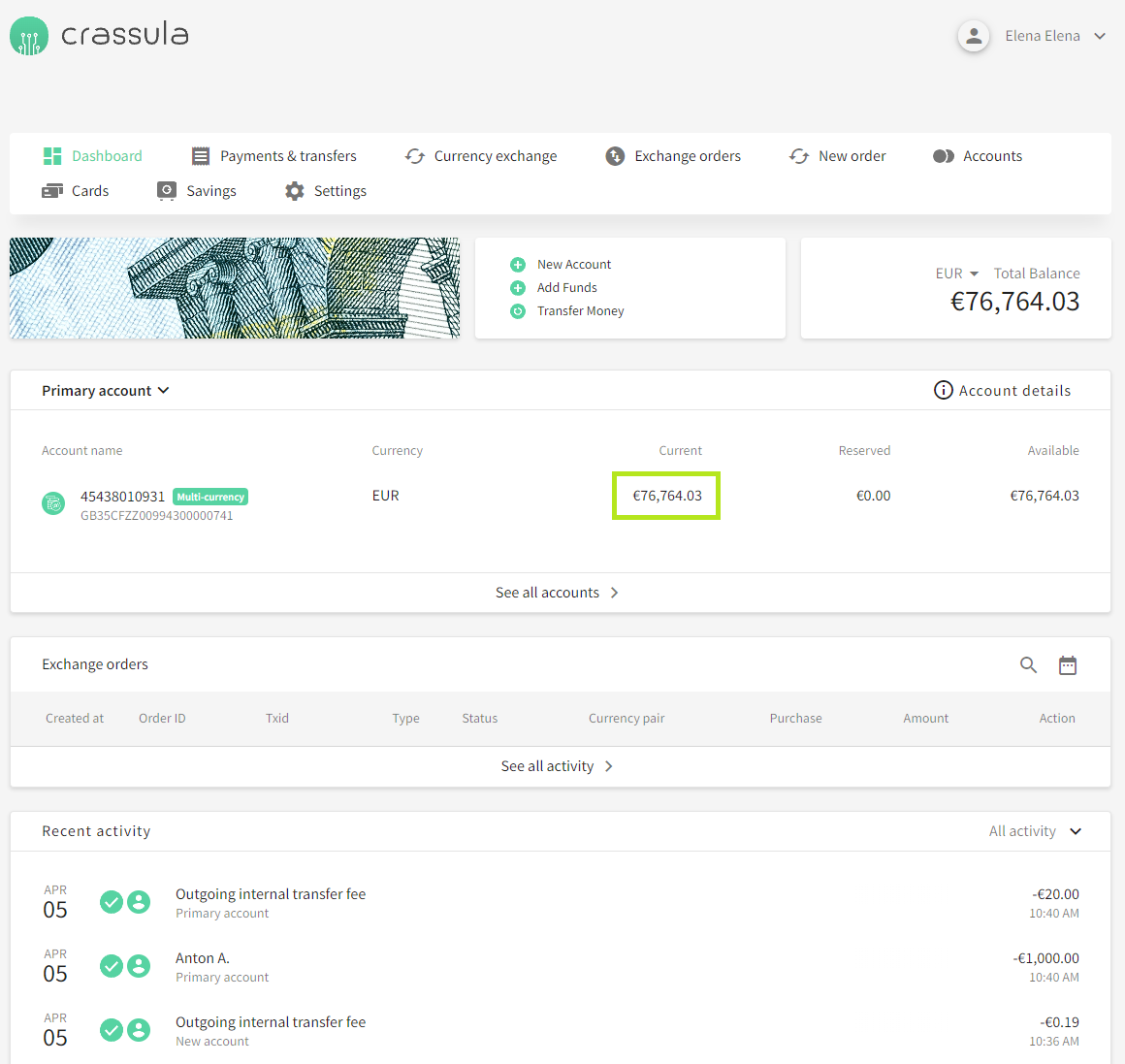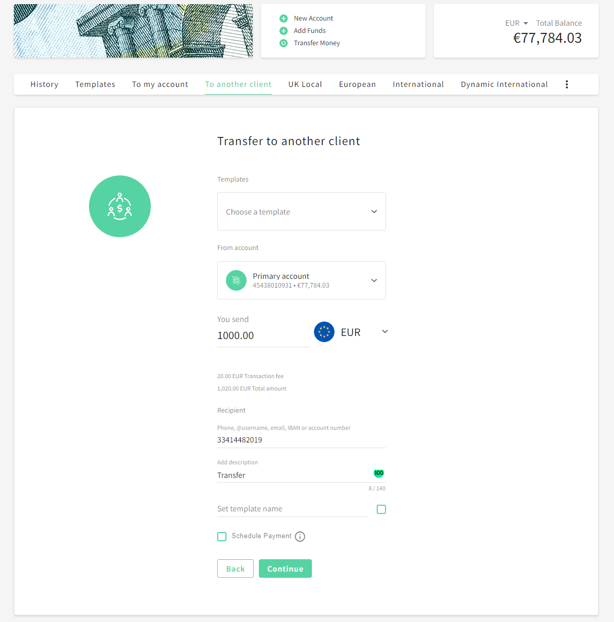Once the transfer is complete, the transaction status is updated in the list of client transactions. The account balance is decreased by 510 EUR (incl. commissions).