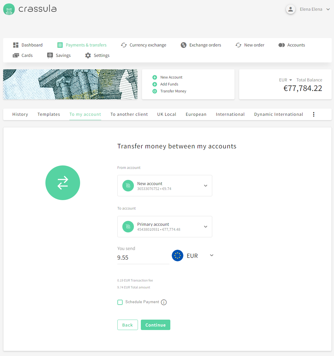 The sum is transferred from New account to Primary account and a commission of 0.19 EUR is charged.