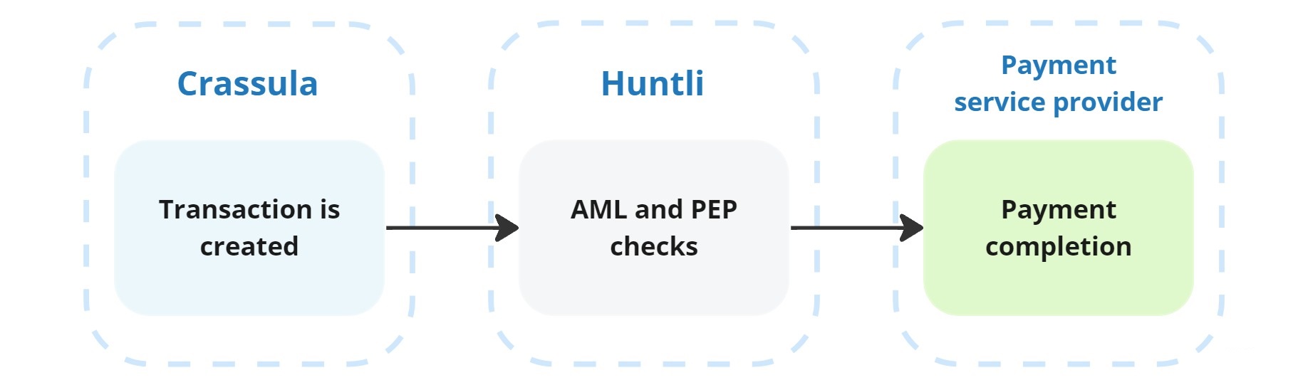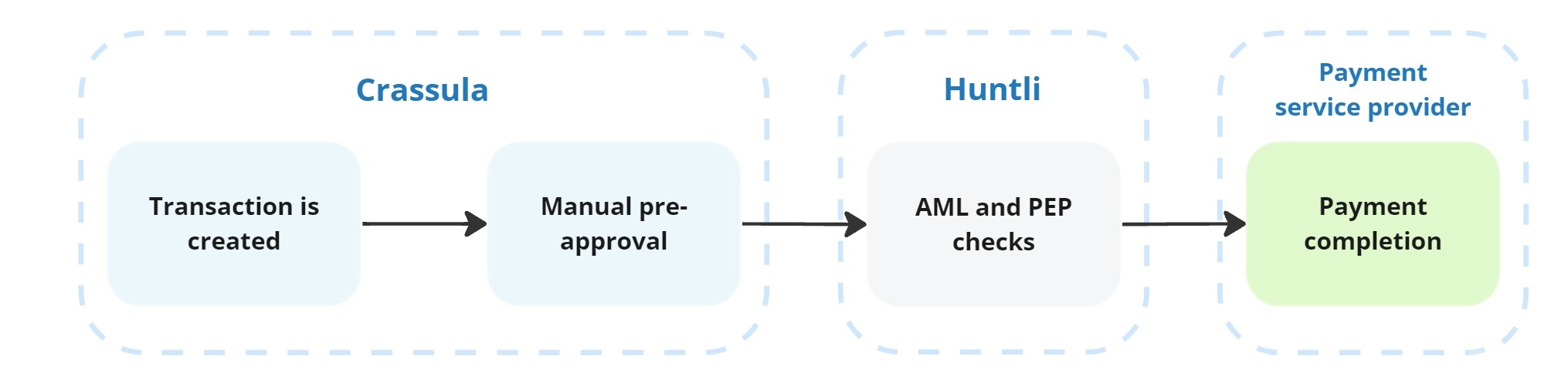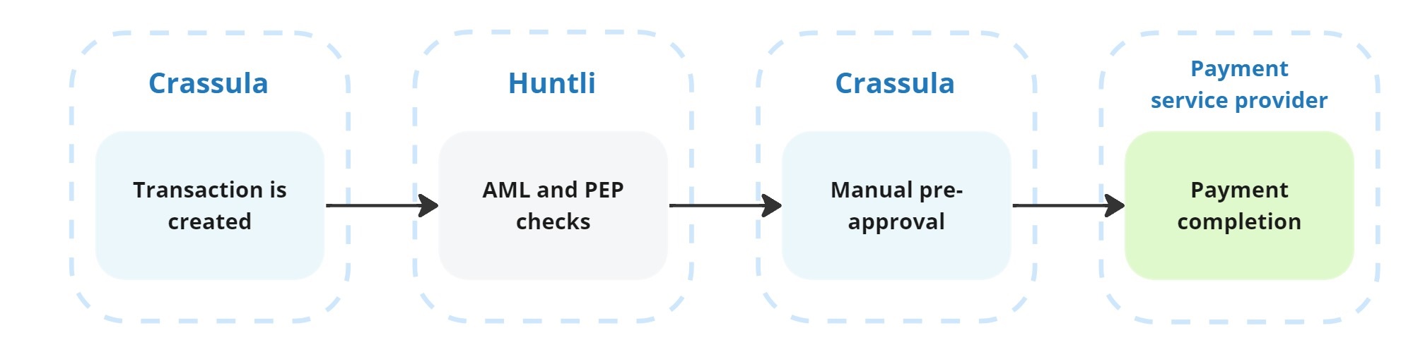 In this workflow, Crassula performs initial manual checks on the transaction. Once the manual checks are completed, the transaction data is sent to Payall for automatic verification. If the transaction passes the automatic checks conducted by Payall, it proceeds to the designated service provider for execution.