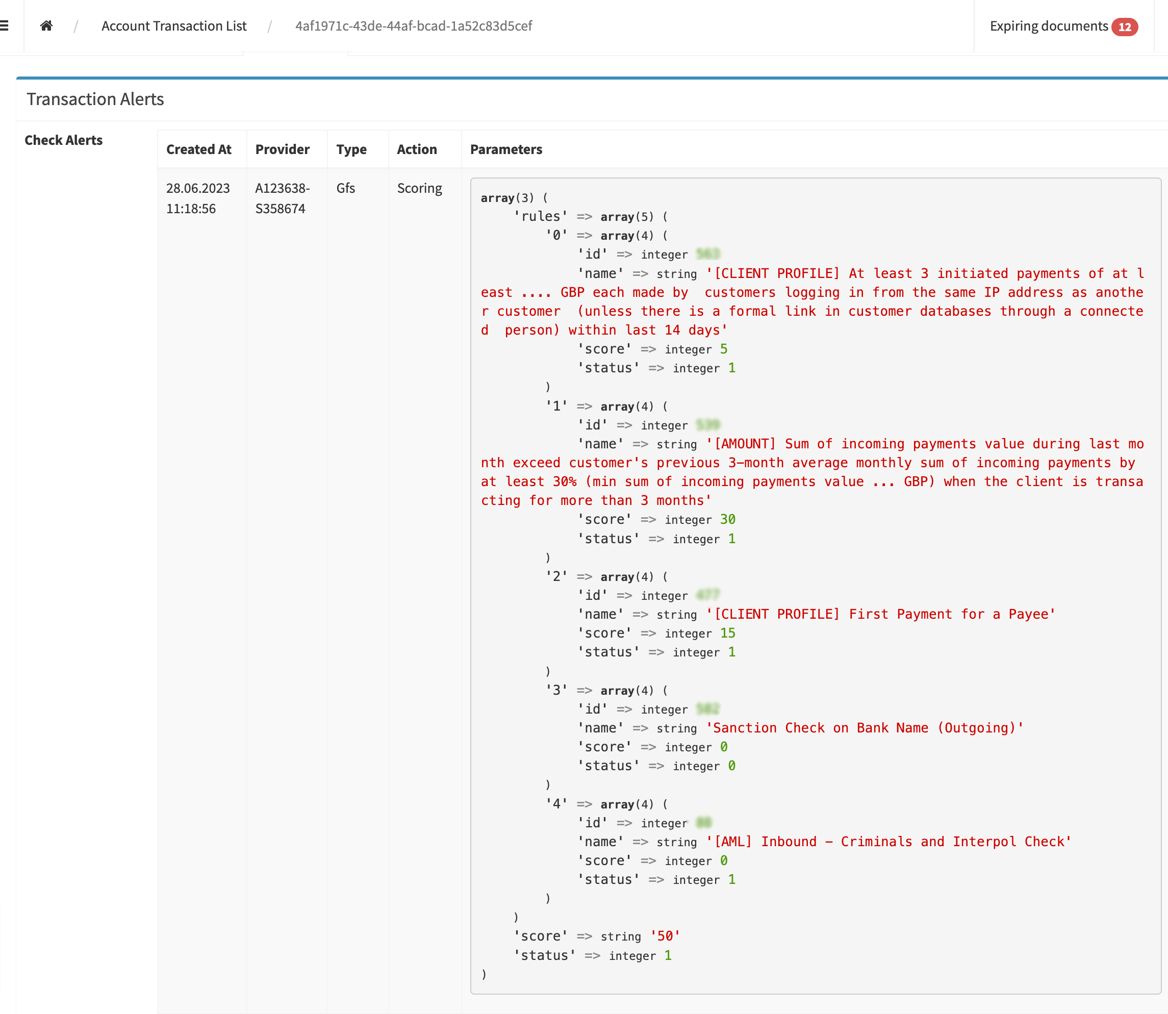 The list of alerts will provide the verification details if Payall checks are made.