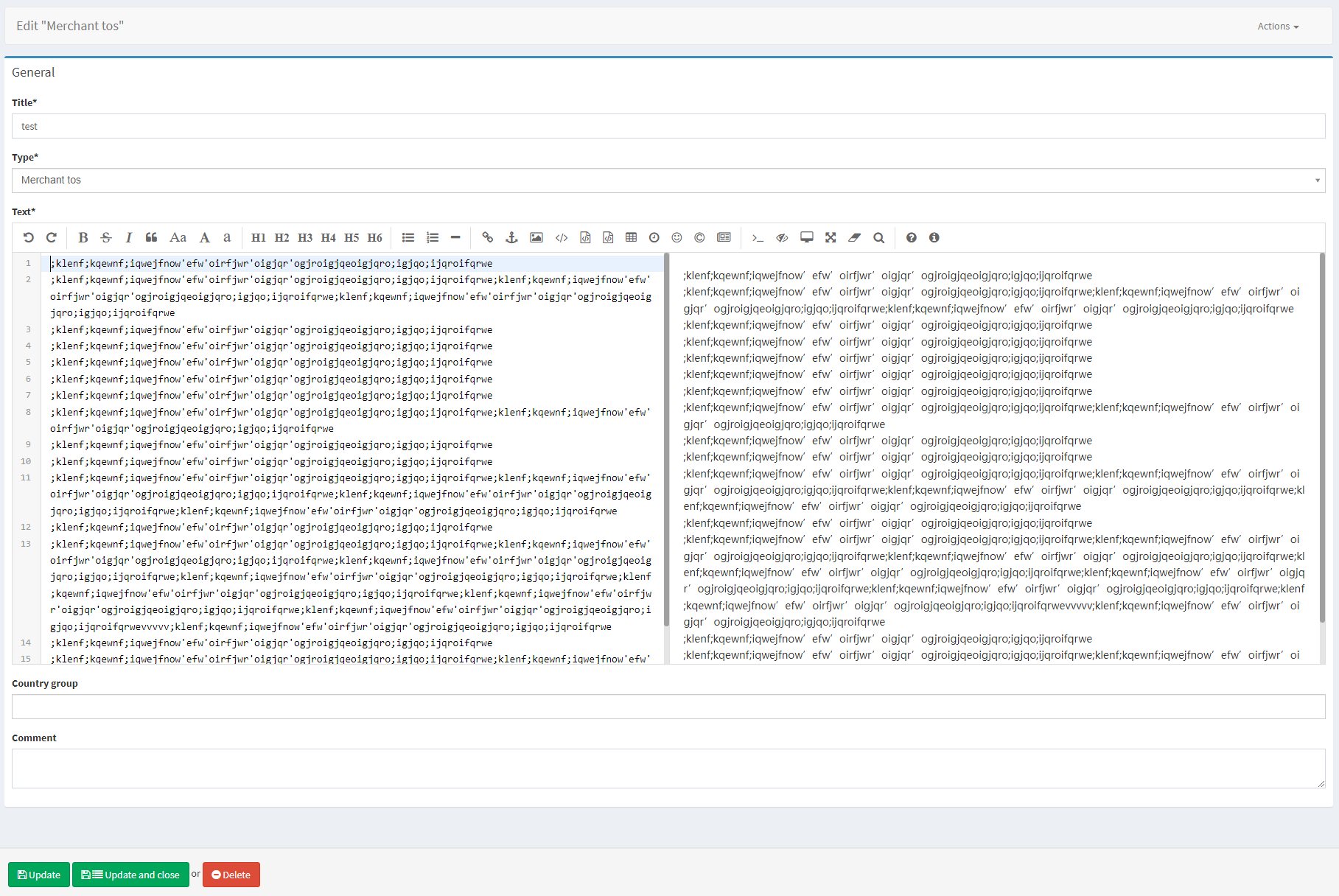 Text | Input the text of the legal document. The format should correspond to the Markdown syntax to be applied as intended. Refer to Markdown guide for more information. The field is mandatory if the Document link field is empty. |