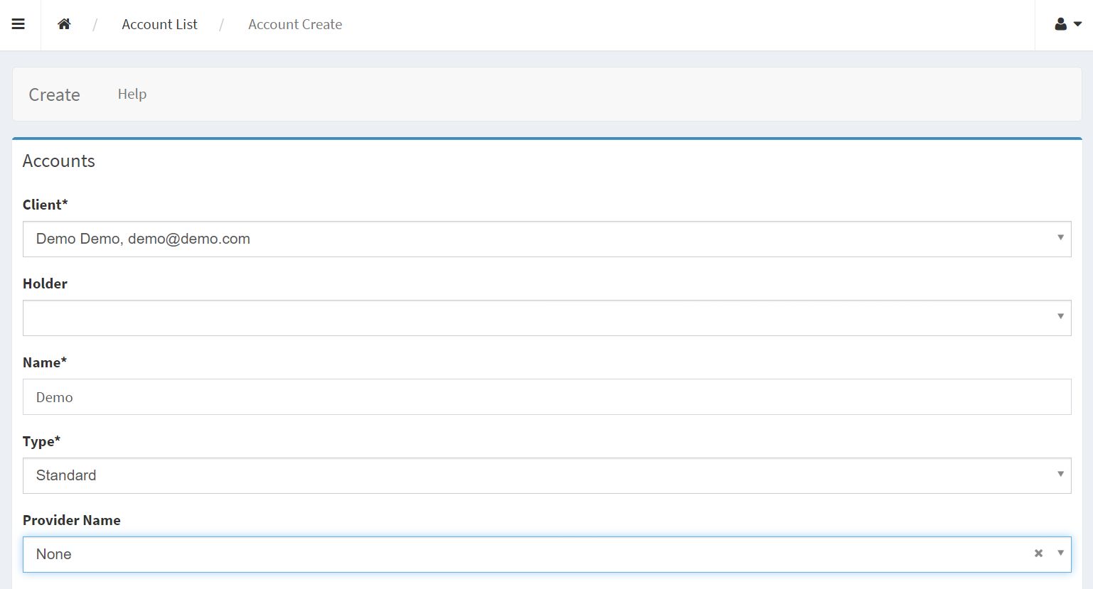 To perform Manual payments, navigate to the Administrative panel and create a new Account for the client with the parameter Provider "None". For more details, see Accounts.