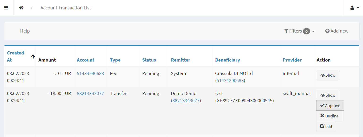 Accounts with no service provider defined in the Provider field are created without account details and can be used for manual transactions. When a manual payment is sent from such accounts, it is processed virtually with no real funds engaged: it is up to the White Label to choose a method of how to deposit real funds to the recipient’s account. Additionally, a White Label can manually generate IBANs for such accounts, though other account details will not be visible in UI.