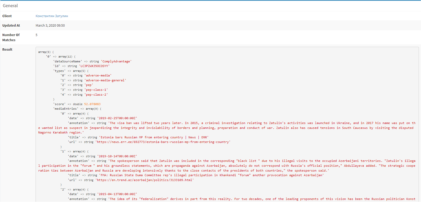 Result | The field includes a detailed response from a service provider. If the client’s personal details match the database or open-source information, an array will be added to the field containing the matching type and its detailed description. An array may contain the following strings: