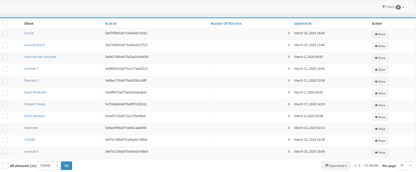 Scan ID | The column demonstrates unique request identification numbers if provided by the screening executor. |