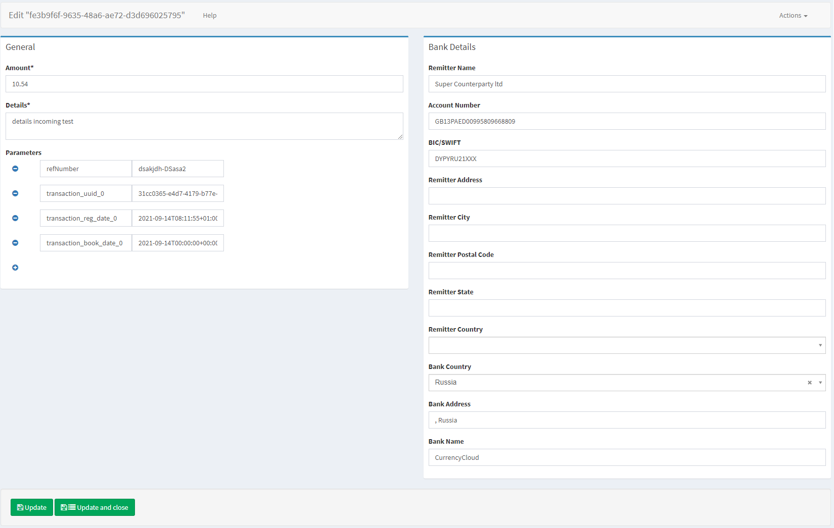 Details | The field allows changing the banking details in case of any errors or misprinting. Once a transaction is complete, it is not possible to change its Bank Details. In order to manage the banking details, the transaction state is to be rolled back manually. |