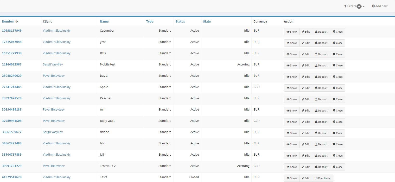 Number | The column demonstrates internal account numbers. At the same time, internal account numbers are used as entity IDs that are available in the Activity log of the Administration section. Click a number to open Vault account details. |