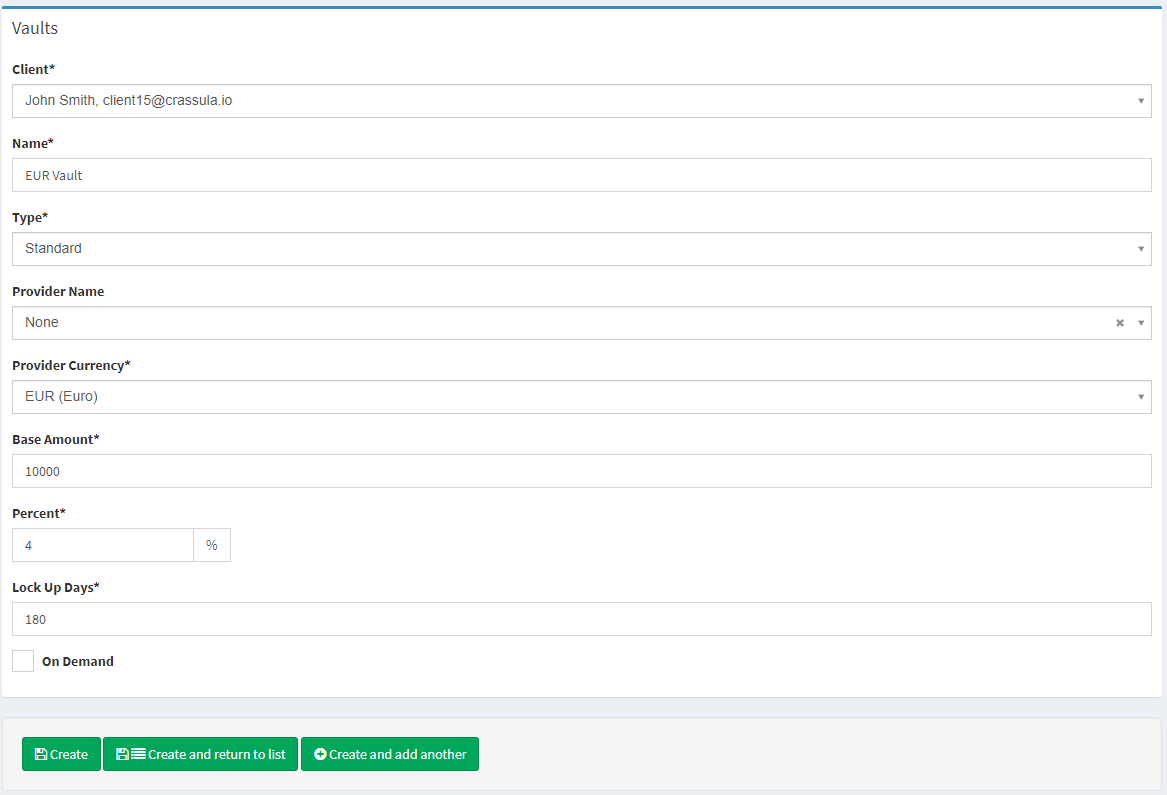 The parameter is defined automatically according to a Price list when creating Vaults via the Web Interface. See Price lists for additional details.Set the On demand parameter to define whether the Vault should remain active after the Lock-up period.