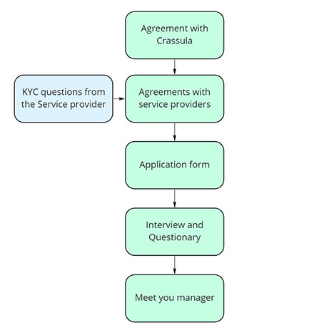 Once the agreement with Crassula is signed, the agreements with service providers should be also prepared. The list of the service providers is defined beforehand.