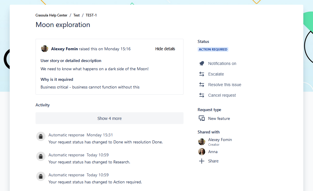 ON HOLD | The request is temporary on pause. We recommend you to check your requests from time to time; either decline the On Hold requests completely, by moving them to CANCELED, or Re-open them for activation. |